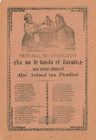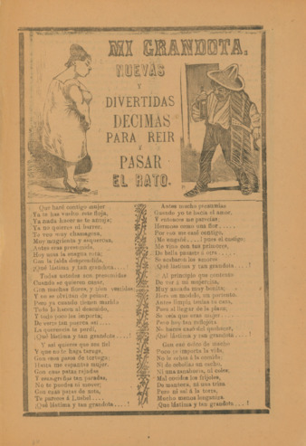 2 páginas color amarillo impresas en offset: 30 x 20 cm | Fragmento de la primera estrofa: "Ya la vieja de mi suegra nomas quiere reganar, deatiro la corta verde no la deja madurar.”