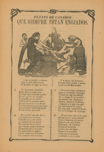 Fragmento de la primera estrofa: "Gran escándalo y alarma hay en este matrimonio, el hombre de rigor se arma.” | 2 páginas color amarillo impresas en offset: 30 x 20 cm