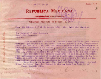 Telegrama de los Srs. Cap. 1º M. Marcos, Tte.Corl. Alfonso Sinenero, Corl. Bruno Casillas, Cap. 1º Manuel Ortigoza, Cap. 1º Luis Perea y Mayor Agustín Gómez al Gral. Alvaro Obregón, recomendándole al Gral. Alberto Basave y Piña para que no sea dado de baja por el Secretario de Guerra y Marina. (Véase el Exp. CARAVEO, Marcelo (Gral.) en esta serie).