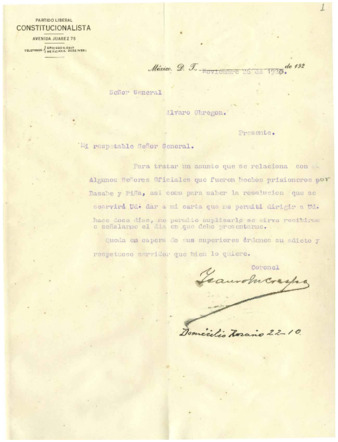 Carta del Sr. Ysauro M. Crespo al Gral. Alvaro Obregón, sobre el asunto de los oficiales que fueron hechos prisioneros por el Gral. Alberto Basave y Piña y solicitando una entrevista.