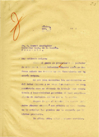 Carta del Gral. Alvaro Obregón al Sr. Manuel Bonfiglio, Contralor General de la Nación, recomendando al Sr. Celestino Jiménez. Exp. J-2
