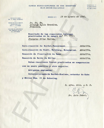 Resultados de los exámenes clínicos practicados al general PEC, expedidos por el doctor Luis Rossi, de la Sección de Laboratorio de la Clínica Médico-Quirúrgica de Vías Digestivas.