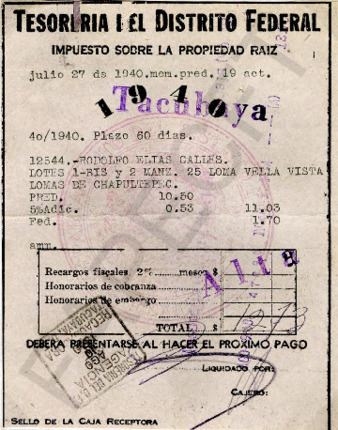 Boletas que expide la Tesorería del Distrito Federal por concepto de impuesto predial de las casas de la calle Sierra Nevada durante los años 1940, 1941 y 1942. Boletas que expide la Dirección de Aguas y Saneamiento del Distrito Federal por concepto de consumo de agua en las casas de la calle Sierra Nevada durante 1941. Boletas que expide la Tesorería del Distrito Federal por derechos de cooperación para pavimento. Boletas que expide la Tesorería del Distrito Federal, Oficina de Recaudación de Aguas, por concepto de consumo de agua en las casas de la calle Sierra Nevada durante 1942. Oficios que envía el señor Rafael Guerra Gómez, jefe de la Oficina del Impuesto Predial, al señor Rodolfo Elías Calles comunicándole que el monto fijado para la renta de las casas de su propiedad es de $ 225.00. Memorándum que envía la Tesorería del Distrito Federal al señor Rodolfo Elías Calles indicándole el monto que debe pagar sobre la renta de sus casas de la calle Sierra Nevada. Cartas que envía el general PEC al Director del Catastro manifestándole las características del predio de la calle Sierra Nevada para su avalúo. Órdenes que envía el ingeniero Arturo Celis I., jefe de la Oficina de Recaudación de Aguas, notificando un cambio de placa en la toma de agua de las casas de la calle Sierra Nevada. Órdenes que envía el Departamento del Distrito Federal, Dirección de Aguas y Saneamiento, Oficina de Conexiones y Medidores, notificando la instalación de medidores en las tomas de agua de las cuatro casas de la calle Sierra Nevada. Liquidaciones que envía la Tesorería del Distrito Federal solicitando el pago de la cooperación para el pavimento de la calle Sierra Nevada.