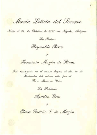 Participación del bautizo de la niña María Leticia del Socorro Rivas Mazon.