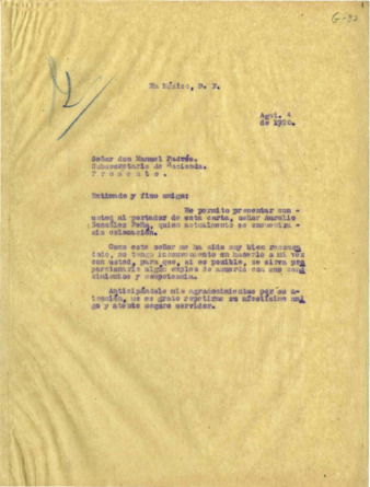 Carta del Gral. Alvaro Obregón al Sr. Manuel Padrés, Subsecretario de Hacienda, recomendando al Sr. Aurelio González Peña. Exp. G-37