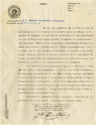 Carta del Lic. Fernando Ruiz Othón, abogado consultor del Departamento y Consejo S. de Salubridad al Dr. Edmundo Torreblanca, Homeópata, solicitándole se dirija a la Cámara de Diputados a fin de que se apruebe la Ley Reglamentaria del Artículo 4o. Constitucional, fijando las profesiones que necesitan título para su ejercicio.