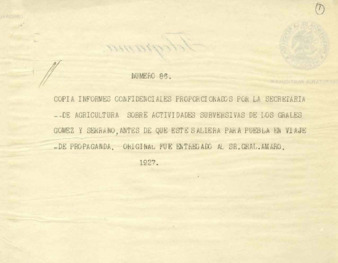 Informe confidencial proporcionado por la Secretaría de Agricultura sobre actividades subversivas de los generales Arnulfo R. Gómez y Francisco R. Serrano, antes de que este último saliera a Puebla en viaje de propaganda.