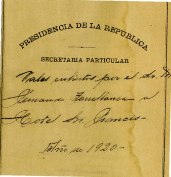 Vales, recibos y cuentas que envía al Sr. Fernando Torreblanca el Sr. Rodolfo Montes y que corresponden a gastos por alojamiento y comidas del Gral. Alvaro Obregón y su comitiva en el Hotel Saint-Francis durante los meses de noviembre y diciembre de 1920.