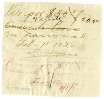 Vales a caja correspondientes a los meses de marzo, julio y agosto de 1920, relativos a medicinas, transporte, música, ayudas, préstamos, estampillas y otros gastos originados durante la campaña política del Gral. Alvaro Obregón. Los vales están firmados por el Gral. Obregón, Ignacio Yslas, J. Sóstenes García, Luis García, Ezequiel Salcedo, Jesús M. Garza, José López Cortés, Desiderio Rivera, Carlos Valencia, Rosario Zúñiga, Francisco Romero, Eloisa Z. de Gil, Alberto Gutiérrez, Margarito Ramírez, Agapito Ortiz, Fernando Torreblanca, Manuel Sandoval, Jesús Silva, Juan Orozco, Francisco Andrade, Francisco Urquizo, Ignacio Hernández, Esteban Ortiz, Jesús Espinosa y Guillermo Ruiz.