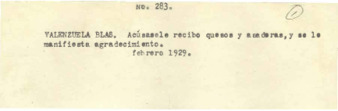 Carta de Blas Valenzuela a Fernando Torreblanca anunciando haberle mandado un queso y unas asaderas. Respuesta agradeciendo.
