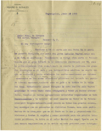 Carta del Gral. Máximo B. Rosales de Tegucigalpa, Honduras al Gral. Alvaro Obregón, felicitándolo por su candidatura a la Presidencia e informando de la deslealtad del Dr. Angel Ugarte que se dice partidario del Gral. Obregón. Respuesta agradeciendo la información. Exp. R-40