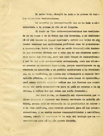 Declaraciones a la prensa del Gral. Alvaro Obregón relativas a su posible reelección. Constancia de retiro de dos caricaturas policromas del Gral. Alvaro Obregón, realizadas por el Sr. A. Audiffred. Una de ellas tiene al pie una referencia a las declaraciones que acaba de lanzar el Gral. Obregón contra la Administración de Justicia de México.