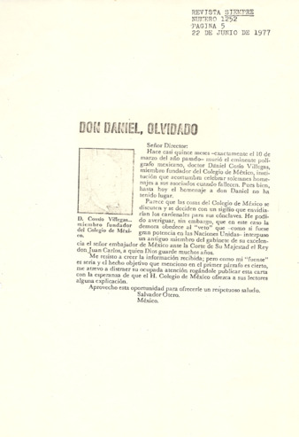 Recorte de la revista Siempre, número 1252, que incluye una carta de Salvador Otero, dirigida al director de este órgano de prensa en la que se cuestiona por qué El Colegio de México no ha realizado un homenaje a Daniel Cosío Villegas, a quince meses de su muerte.