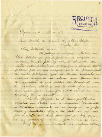 Fondo: Álvaro Obregón/3. Sección: Primera campaña política/3.1 Serie: Correspondencia 1919, segunda mitad (sub-serie original)