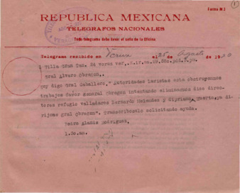 Telegrama del Sr. Pedro Alanís Rodríguez al Gral. Alvaro Obregón, informando que las autoridades laristas impiden hacer propaganda obregonista.