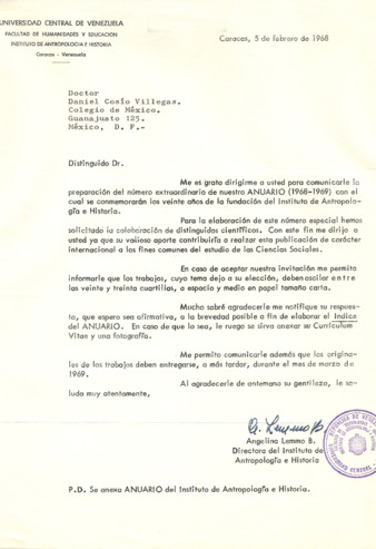 Correspondencia entre Daniel Cosío Villegas y Angelina Lemmo B., directora del Instituto de Antropología e Historia, en la que invita a Cosío Villegas a colaborar en el anuario de dicho instituto. Incluye respuesta de Cosío Villegas.