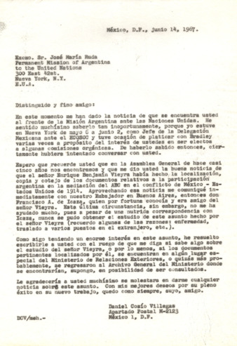 Correspondencia entre Daniel Cosío Villegas, embajador de México en el Consejo Económico y Social de las Naciones Unidas, y José María Ruda, representante permanente de la República Argentina ante las Naciones Unidas, relacionada con una solicitud realizada por Cosío a Ruda para obtener copias de los documentos diplomáticos utilizados por Enrique Benjamín Vieyra en su estudio sobre la participación del gobierno argentino en la mediación del ABC de 1914.
