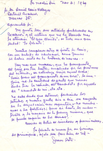 Correspondencia entre Jesús Soto y Daniel Cosío Villegas, en la que Jesús felicita a Cosío Villegas por su artículo titulado El gran alarido, publicado en el periódico Excélsior.