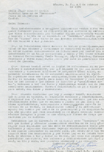 Carta de Elena V. de la Peña, dirigida a Julio Sherer García, director del periódico Excélsior, en la que solicita información del motivo de la desaparición de los artículos de Alejandro Gómez Arias. Asimismo, agradece y felicita la colaboración de Rosario Castellanos, Daniel Cosío Villegas, López Narváez, Carmona Nenclares y Abel Quezada como articulistas del periódico.