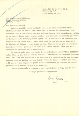 Cartas de Rafael Roeder, dirigidas a Daniel Cosío Villegas, en las que agradece el envío del ejemplar de Historia Moderna de México relativo a las relaciones diplomáticas entre México y Estados Unidos. Asimismo, felicita a Cosío Villegas por sus conferencias sobre Sebastián Lerdo de Tejada y Porfirio Díaz.