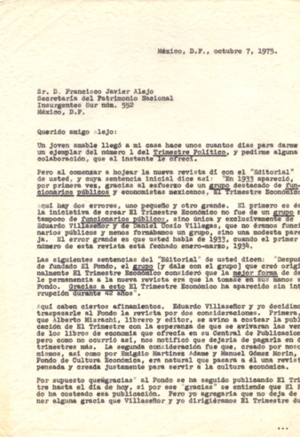 Carta de Daniel Cosío Villegas dirigida a Francisco Javier Alejo, de la Secretaría de Patrimonio Nacional, en la que aclara las inconsistencias que él publica respecto a la fundación de la revista Trimestre Económico, al no darle el crédito a Daniel Cosío Villegas y Eduardo Villaseñor, como los verdaderos fundadores de la revista.