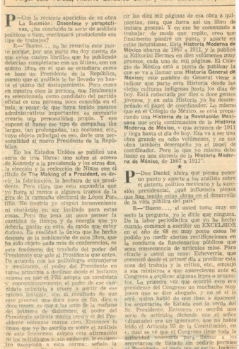 Serie de cuatro artículos de prensa con el título Cosío Villegas: Política y Educación, en los que transcribe entrevista realizada por Miguel Ángel Sola Valdés, Alberto Curiel y Raúl Reyes a Daniel Cosío Villegas. En la entrevista Cosío comenta su última publicación titulada La sucesión: desenlace y perspectiva.