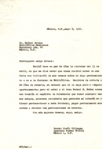 Correspondencia entre Daniel Cosío Villegas, Rafael Solana, y Rafael F. Muñoz, directores de la colección de publicaciones Bibliófilos de México Editorial Oasis, S.A., relativa a la renovación de la suscripción de Cosío Villegas y del envío de las obras publicadas por la editorial.