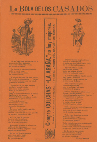 1 hoja color anaranjado impresa en offset: 30 x 20 cm; Fecha de publicación no identificada | Fragmento de la primera estrofa: "Por ahí va la bola, muchachos, ahí vá pongan sentido y cuidado, esta nueva bola la ván á rodar los solteros y casados”