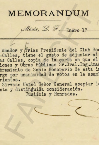 Correspondencia entre Luis Amador Frías y el Gral. PEC relativa al Partido Socialista Independiente Pro-Calles. Memorándum de Amador, Presidente del Club Socialista Independiente Pro-Calles, al Gral. PEC. Le informa que el Gral. Amado Aguirre, Ministro de Comunicaciones y Obras Públicas, ha sido nombrado socio honorario del Club Socialista Independiente Pro-Calles.