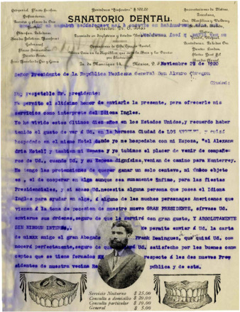 Carta del Sr. Frank C. Drew al Gral. Alvaro Obregón, recomendando al Sr. A.L. Wilde, quien en otra carta le ofrece un aeroplano en venta para hacer sus giras políticas.