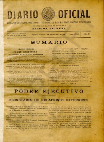 Ejemplar del Diario Oficial: Órgano del Gobierno Constitucional de los Estados Unidos Mexicanos, jueves 4 de diciembre de 1941, tomo CXXIX, Núm. 28.