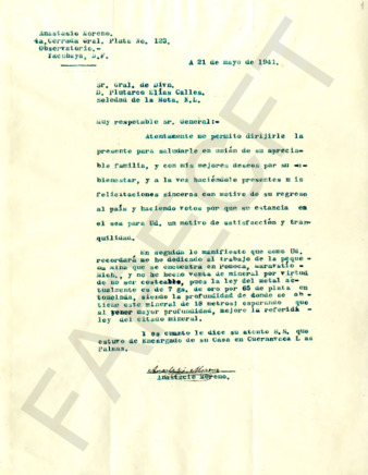 Carta que envía el señor Guillermo Moreno Calles -hijo de Belisario Moreno y de Aquila Calles, media hermana del general PEC por ser hijos de la misma madre, Ma. de Jesús Campuzano. El padre de Aquila Calles fue Francisco Calles, primer marido de Ma. de Jesús Campuzano. El segundo esposo de Ma. de Jesús Campuzano fue Plutarco Elías Lucero, padre del Gral. PEC- al general PEC saludándolo, diciéndole que está trabajando mucho con el general Rodríguez, gobernador del estado de Sonora, por la colonia nueva que está haciendo junto a la Cruz Gálvez y externándole los parabienes de toda su familia.