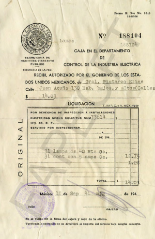 Recibos que expide la Tesorería de la Federación, Control Electrotécnico, al general PEC por derecho de inspección a instalaciones eléctricas. Recibos que expide la Compañía Mexicana de Luz y Fuerza Motriz, S.A., por concepto de consumo de energía eléctrica en la casa de la calle Juan de Acuña durante 1941. Boletas que expide la Compañía Mexicana de Luz y Fuerza Motriz, S.A., por concepto de consumo de energía eléctrica en la casa de la calle Juan de Acuña durante 1942 y 1943.