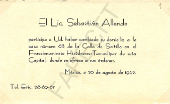 Participación que envía el Licenciado Sebastián Allende al General PEC informándole sobre su cambio de domicilio.