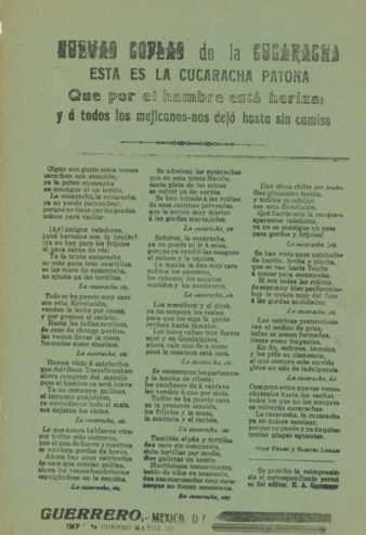 Nuevas coplas de la cucaracha: esta es la cucaracha patona que por el hambre está eriza y a todos los mexicanos nos dejo hasta sin camisa