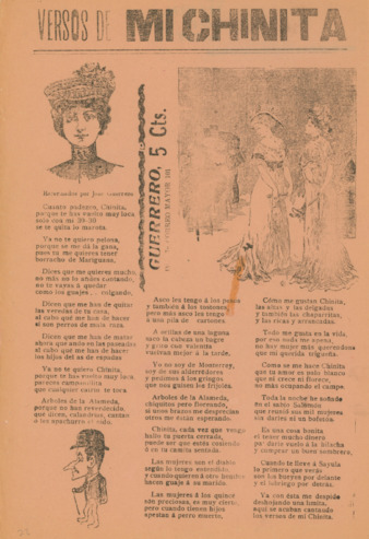 1 hoja color verde impresa en offset: 30 x 20 cm; Fecha de publicación no identificada | Fragmento de la primera estrofa: "Cuanto padezco, Chinita, porque te has vuelto muy loca, solo con mi 30-30 se te quita lo marota."