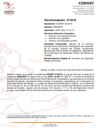 Sobre el caso de violación de los derechos a la vida, a la libertad, a la integridad personal y al reconocimiento a la personalidad jurídica, por desaparición forzada atribuida a policías municipales de Ciudad Valles.