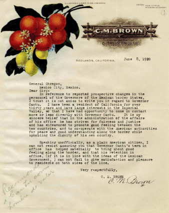Carta del Sr. C.M. Brown, empacador y embarcador de frutas en los Estados Unidos, en la que elogia al Gobernador de Baja California, Esteban Cantú.