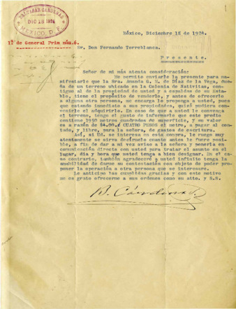 El Sr. Baltazar Cárdenas, a nombre de la Sra. Amanda G.M. de Díaz de la Vega, ofrece en venta a Fernando Torreblanca un terreno en la colonia Nativitas. Respuesta indicando que no le interesa.