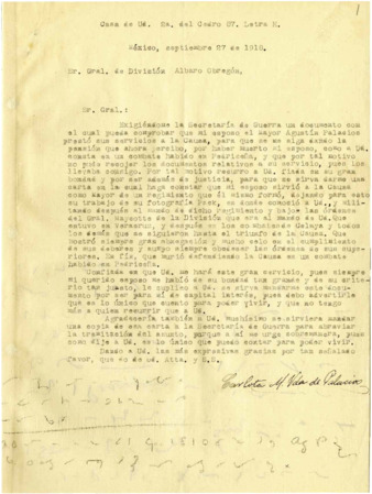Carta de la Sra. Carlota M. Vda. de Palacios al Gral. Alvaro Obregón, pidiéndole un certificado de servicios prestados a la Revolución por su esposo, el Mayor Agustín Palacios.