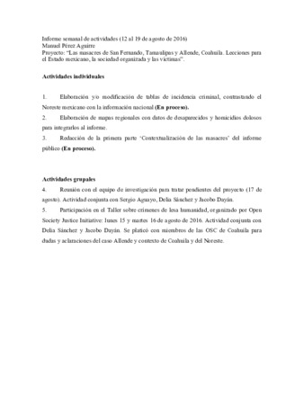 Informe semanal de actividades de Manuel Pérez Aguirre del 12 al 19 de agosto de 2016.
