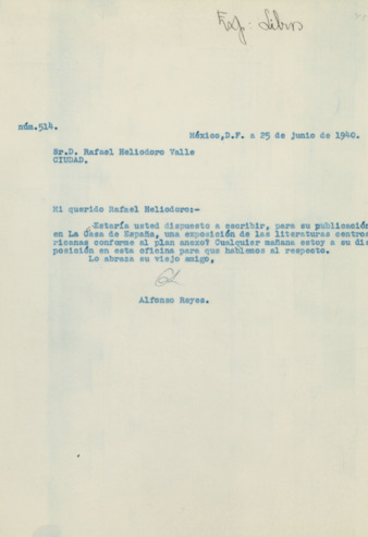 Carta de Alfonso Reyes, dirigida a Rafael Heliodoro Valle, en la que le ofrece publicar un texto sobre las literaturas centroamericanas, como parte del plan editorial de La Casa de España en México.