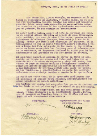 Constancia de compra-venta de garbanzo entre el Gral. Alvaro Obregón y el Sr. Benito Sáenz. Condiciones de la negociación.