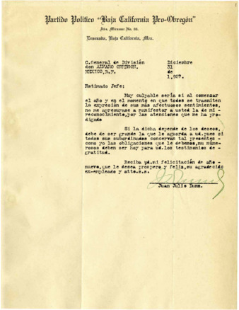 Fondo: Álvaro Obregón/1. Sección: Etapa armada de la Revolución Mexicana/1.3 Serie: Distrito Norte del Territorio de Baja California/1.3.2 Subserie: Gobierno del Distrito Norte del Territorio de Baja California