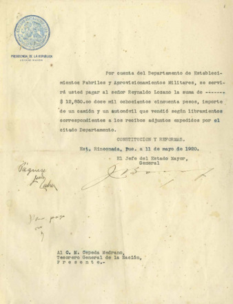 Documentación relativa al pago que por orden del Jefe del Estado Mayor, Gral. Juan Barragán, hacen el Departamento de Establecimientos Fabriles y Aprovisionamientos Militares y la Secretaría de Hacienda al Sr. Reynaldo Lozano, por dos automóviles que vendió. (NOTA: Esta documentación fue integrada sin motivo a Fondo Reservado de donde se sacó para ponerla aquí).