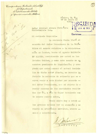 Carta del Corl. Alberto Salinas, de Establecimientos Fabriles y Aprovisionamientos Militares al Gral. Alvaro Obregón, pidiendo localice a un agente comisionado en Estados Unidos por el Gral. Obregón, para que entregue cuentas. Respuesta indicando lo localizará. Telegrama del Corl. Alberto Salinas al Gral. Alvaro Obregón felicitándolo. (Ver Exp. A-4 23 Inv. 0771 ALMADA, Baldomero A. - de la misma serie 020700).