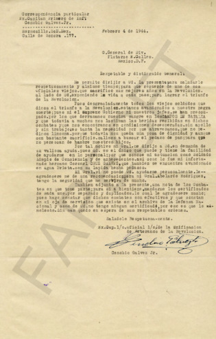 Carta que envía el ex Cap. 1° Cenobio Gálvez Jr. -hermano del extinto coronel José Cruz Gálvez- al general PEC solicitándole que le conceda su ayuda para aliviar su difícil situación y que le extienda certificados de los combates en los que tomó parte.