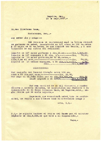 Carta del Gral. Alvaro Obregón a su hermano Alejandro pidiéndole que deposite en su cuenta sólo una parte del dinero que le debe.