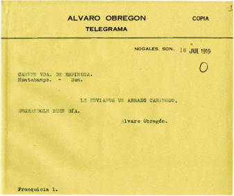 Fondo: Álvaro Obregón/2. Sección: Estancia en Sonora/2.7 Serie: Correspondencia 1919, primera mitad (sub-serie original)