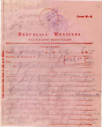 Telegrama de los Srs. Francisco Cano, Aurelio Perdomo, Heriberto Juárez, F. García y otros al Gral. Alvaro Obregón, felicitándolo por su triunfo electoral.